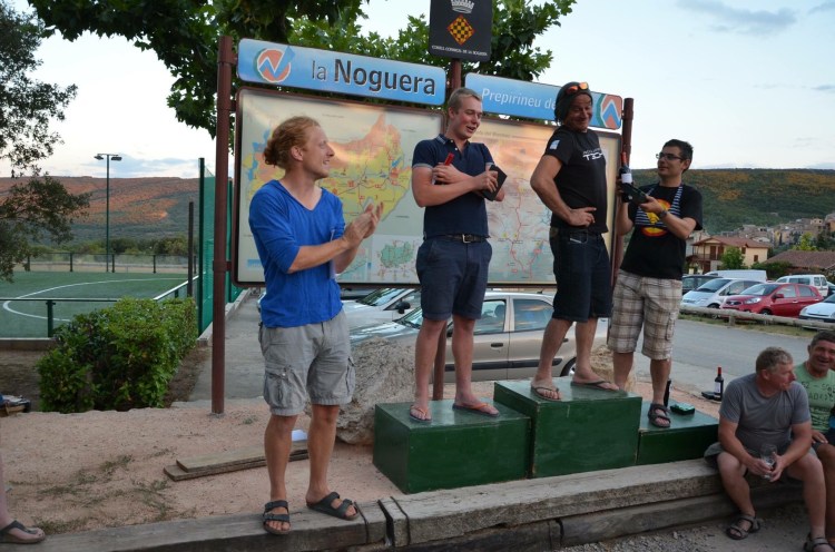 Zaterdag is de laatste dag van de competitie. Er is een moeilijke taak waarbij maar enkele mensen op goal komen. Ik maak een ochtendvlucht en heb daarna met Xesco afgesproken, een vriend van een vorige competitie in Spanje, die een huisje heeft in Ager. Samen met het gezin en nog een Spaanse vriend van hen (die helaas geen Engels kan, en ik geen Spaans!) zoeken we een meertje op, spelen wat met het zoontje (2,5 maand oud) en de honden. Om kwart voor vijf stelt Xesco voor: “Zullen we gaan lunchen?”. Ik kijk een beetje ongelovig en moeilijk en bedenk me dan dat het Spaanse (of Catalaanse) ritme nog afwijkender is dan ik dacht. Ja graag, lunch! Ik krijg een rondleiding in hun huisje en na de lunch bezoeken we een geitenboerderij aan de rand van het dorp. Er is geen officieel verkooppunt, maar aan bekenden verkoopt de eigenaar geitenkaas. Jummie! Helaas zijn ze niet thuis, morgenochtend proberen we het nog eens. Terug op de camping wordt het langzaamaan tijd voor de prijsuitreiking. Lode en Natha banen zich op humoristische wijze een weg door de vele prijsklassen, met als hoogtepunt de Belgische kampioenen 2016 natuurlijk!